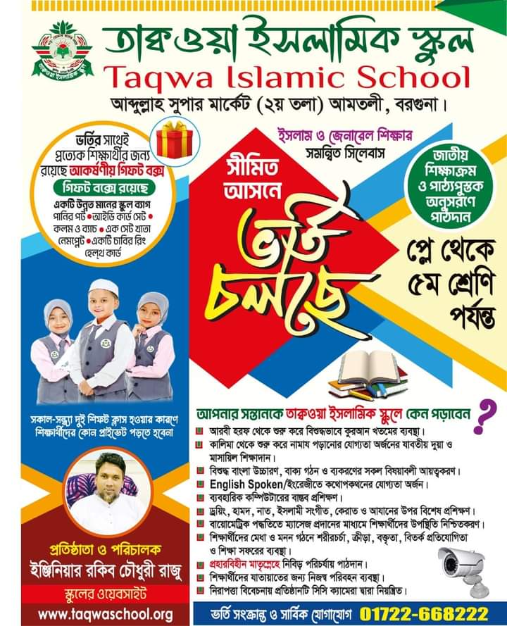 আমাদের লক্ষ্য ও উদ্দেশ্য- তাক্বওয়া ইসলামিক স্কুল প্রতিষ্ঠিত হয়েছে এক মহৎ উদ্দেশ্যে—একই সাথে আধুনিক সাধারণ শিক্ষা এবং ইসলামিক শিক্ষার সমন্বয়ে শিক্ষার্থীদের যোগ্য, দক্ষ ও নৈতিক মানুষ হিসেবে গড়ে তোলা। আমাদের অঙ্গীকার হলো শিক্ষার্থীদের শুধু পরীক্ষার ফলাফল নয়, বরং জীবন গঠনের জন্য প্রয়োজনীয় সব ধরনের দীক্ষা প্রদান। আমাদের বৈশিষ্ট্য আধুনিক জাতীয় কারিকুলামের পাশাপাশি কোরআন-হাদীস ও ইসলামিক শিক্ষা। অভিজ্ঞ ও প্রশিক্ষিত শিক্ষক মণ্ডলী। ছোট্ট শিক্ষার্থীদের জন্য প্লে থেকে শুরু করে ধাপে ধাপে উচ্চতর শ্রেণি পর্যন্ত পাঠদান। পড়াশোনার পাশাপাশি চারিত্রিক উন্নয়ন, শিষ্টাচার ও নৈতিক শিক্ষায় বিশেষ গুরুত্ব। সুন্দর ও স্বাস্থ্যসম্মত পরিবেশে ক্লাস পরিচালনা। অভিভাবকবান্ধব যোগাযোগ ব্যবস্থা, যাতে বাচ্চাদের অগ্রগতি নিয়মিতভাবে জানানো হয়। আলাদা করে কোচিং বা প্রাইভেট পড়াশোনার প্রয়োজন হয় না। আমাদের দৃষ্টিভঙ্গি ভবিষ্যৎ প্রজন্মকে এমনভাবে গড়ে তোলা যাতে তারা ইসলামিক মূল্যবোধে বিশ্বাসী, সমাজ ও দেশের প্রতি দায়িত্বশীল, এবং আধুনিক বিজ্ঞান ও প্রযুক্তি জ্ঞানেও সমৃদ্ধ হয়।